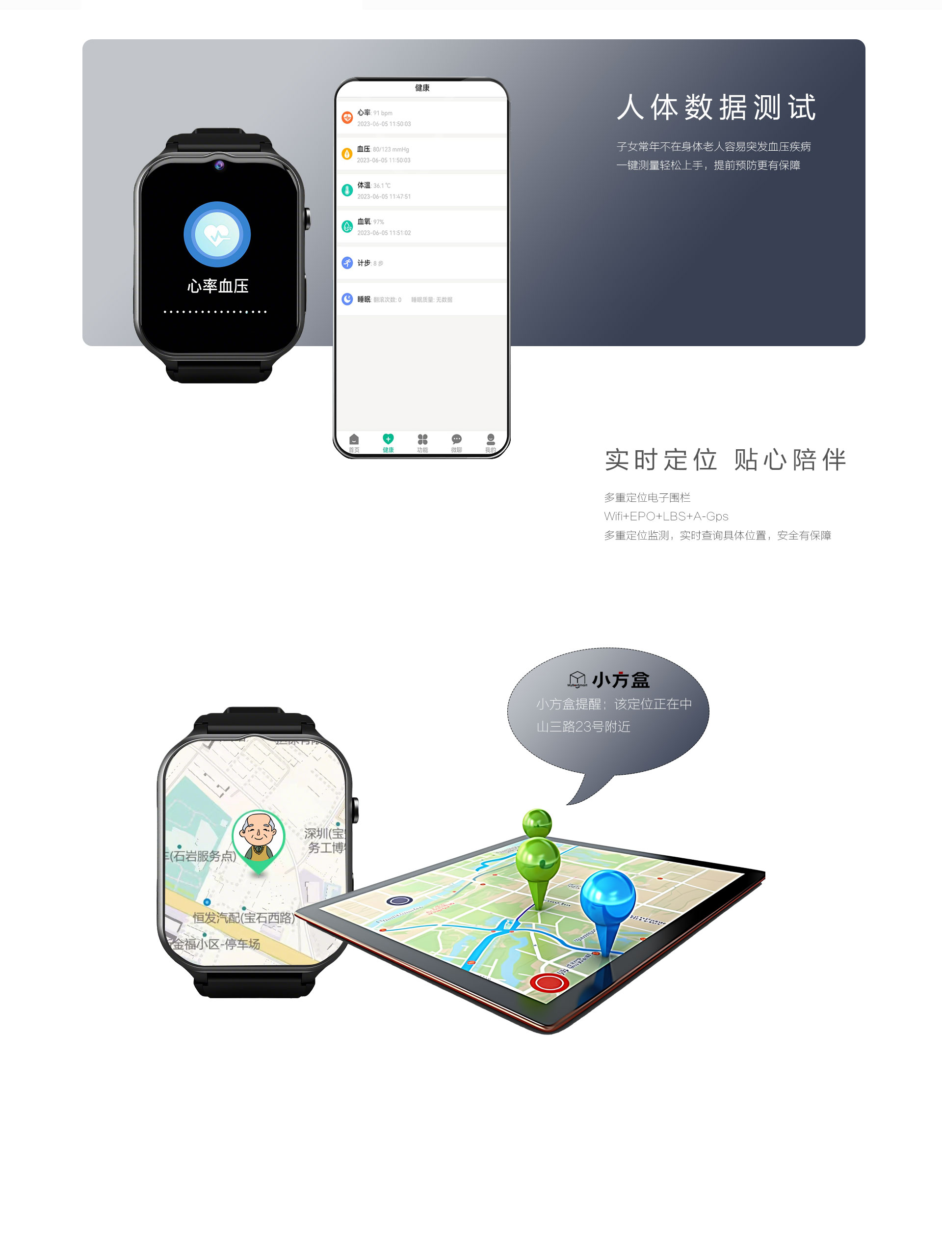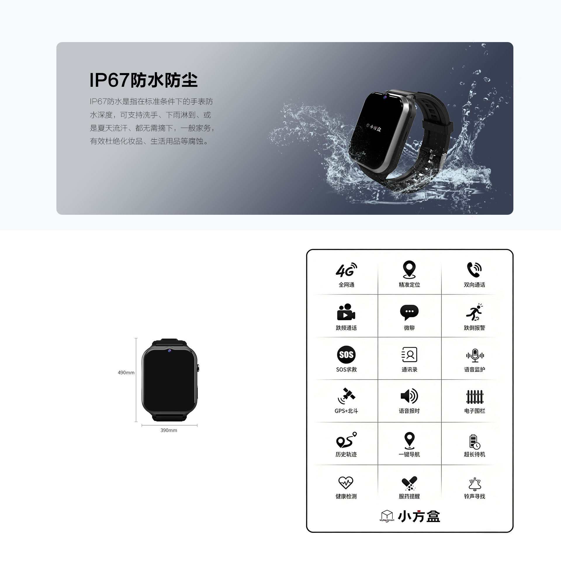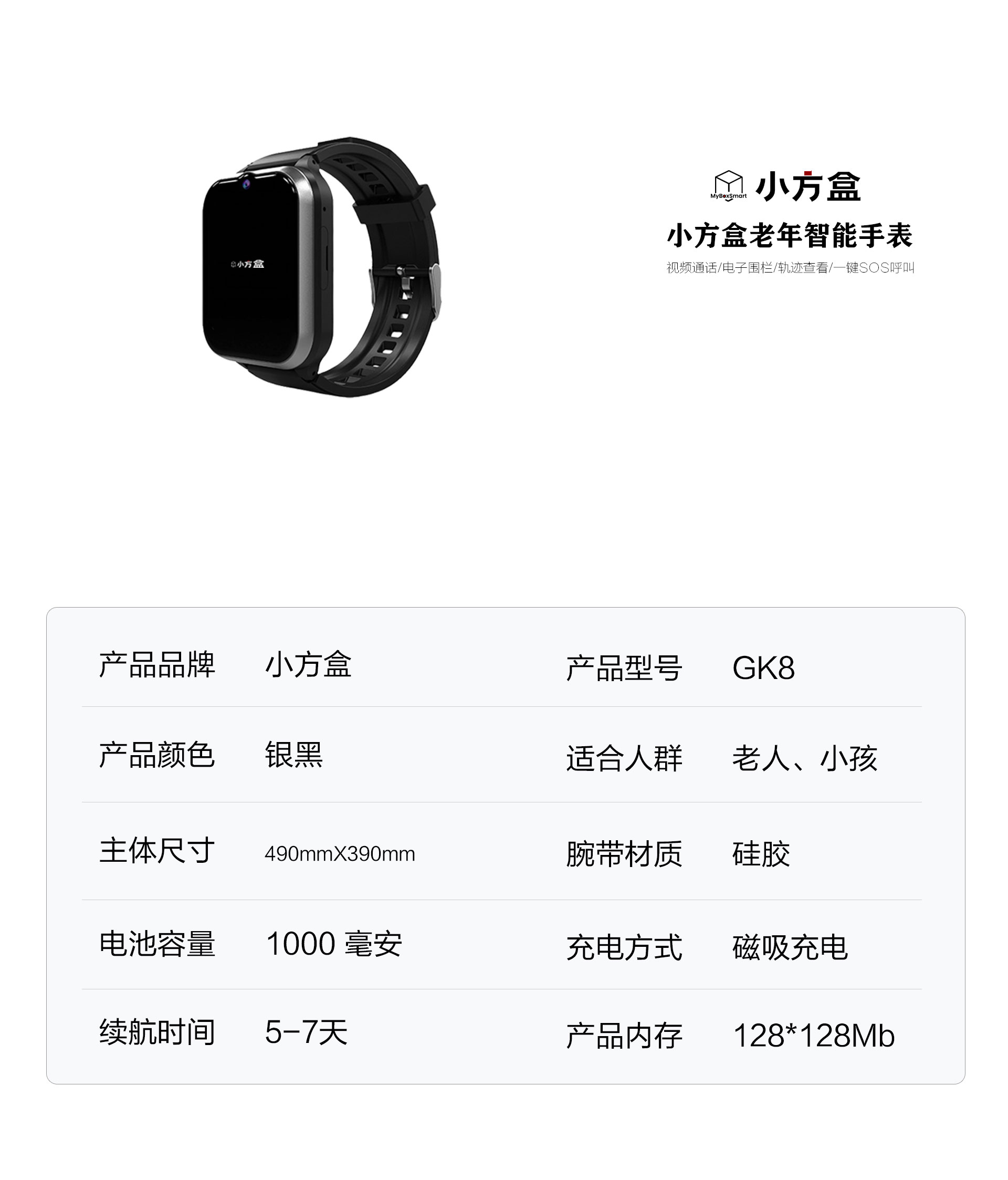 多种报警方式:电话、短信微信公众号、APP、电脑端 多种功能可选:电子围栏、轨迹查看、视频通话、高温报警、心率血氧测量 定位方式:卫星+WIFI+LBS+AGPS 电池:800mAh聚合物电池 防水等级:IP68 通讯:4G全网通
